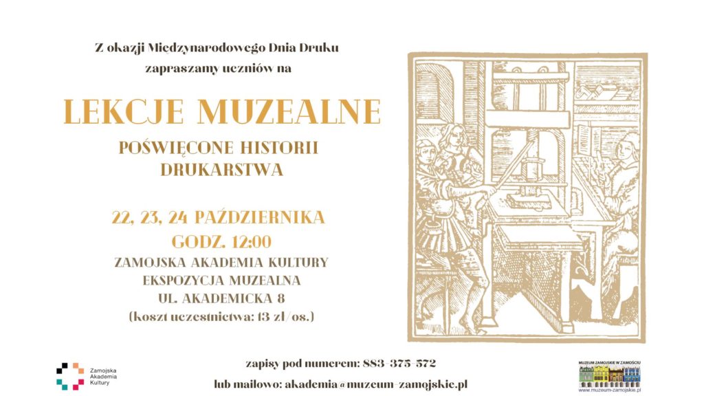 Z okazji Międzynarodowego Dnia Druku zapraszamy do wzięcia udziału w lekcjach muzealnych dotyczących historii drukarstwa, które odbywać się będą na Ekspozycji muzealnej w budynku dawnej Akademii Zamojskiej.