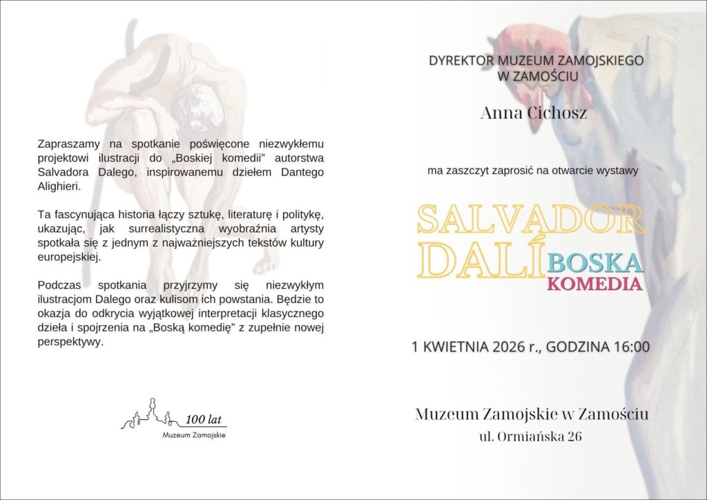 Muzeum Zamojskie w Zamościu zaprasza na wyjątkową wystawę prezentującą cykl 100 grafik autorstwa Salvadora Dalí – jednego z najbardziej rozpoznawalnych artystów XX wieku. Inspirowane Boską komedią Dantego Alighieri prace prowadzą widza przez trzy niezwykłe przestrzenie: Piekło, Czyściec i Raj.